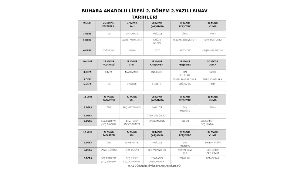 "Buhara Anadolu Lisesi 2.Dönem 2.Yazılı Sınav Tarihleri"